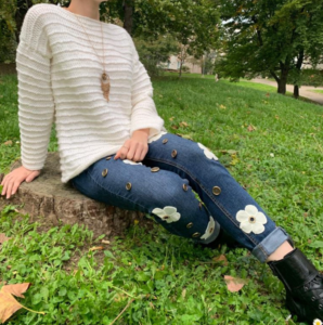 Quant au jean, il s’agit d’une customisation réalisée avec des restes de galon provenant de chez Mon Galon. J’ai eu un véritable coup de cœur pour ce qu’ils proposent : leurs galons sont de véritables petites pépites.